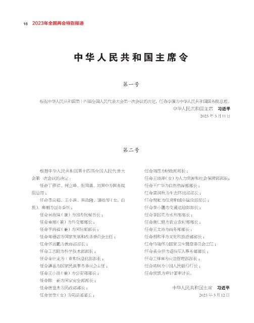 任命贺荣(女)为司法部部长 ; 2023 年 3 月 12 日