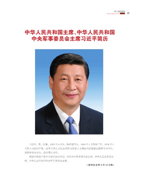 四川党的建设 www.scdjw.com.cn 2023 17 中华人民共和国主席、中华人民共和国 中央军事委员会主席习近平简历 习近平,男,汉族,1953 年 6 月生,陕西富平人,1969 年 1 月参加工作,1974 年 1 月加入中国共产党,清华大学人文社会学院马克思主义理论与思想政治教育专业毕业, 在职研究生学历,法学博士学位。 现任中国共产党中央委员会总书记,中共中央军事委员会主席,中华人民共和国主 席,中华人民共和国中央军事委员会主席。 (新华社北京 3 月 10 日电)