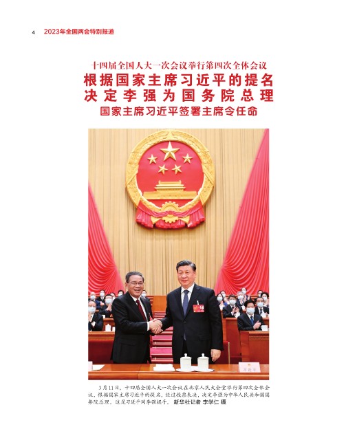 4 2023年全国两会特别报道 十四届全国人大一次会议举行第四次全体会议 根据国家主席习近平的提名 决定李强为国务院总理 国家主席习近平签署主席令任命 3 月11日,十四届全国人大一次会议在北京人民大会堂举行第四次全体会 议,根据国家主席习近平的提名,经过投票表决,决定李强为中华人民共和国国 务院总理。这是习近平同李强握手。 新华社记者 李学仁 摄