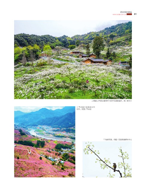 四川党的建设 四川党的建设 四川党的建设 61 61 www.scdjw.com.cn 202320232023 61 w. cn com. www.scdjw.com.cn www. cdj s 峨眉山市绥山镇荷叶村李子花迎春盛开。图 / 袁学方 平武县万亩桃花分外 夺目。供图 / 平武组 鸟语花香。供图 / 苍溪县融媒体中心