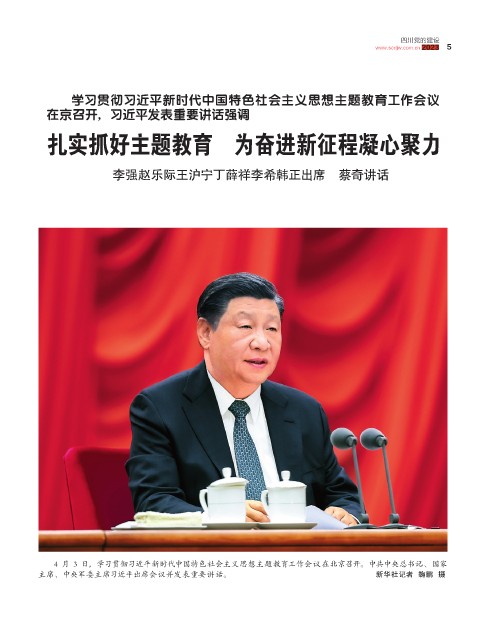 四川党的建设 www.scdjw.com.cn 2023 5 学习贯彻习近平新时代中国特色社会主义思想主题教育工作会议 在京召开,习近平发表重要讲话强调 扎实抓好主题教育 为奋进新征程凝心聚力 李强赵乐际王沪宁丁薛祥李希韩正出席 蔡奇讲话 4 月 3 日,学习贯彻习近平新时代中国特色社会主义思想主题教育工作会议在北京召开。中共中央总书记、国家 主席、中央军委主席习近平出席会议并发表重要讲话。 新华社记者 鞠鹏 摄