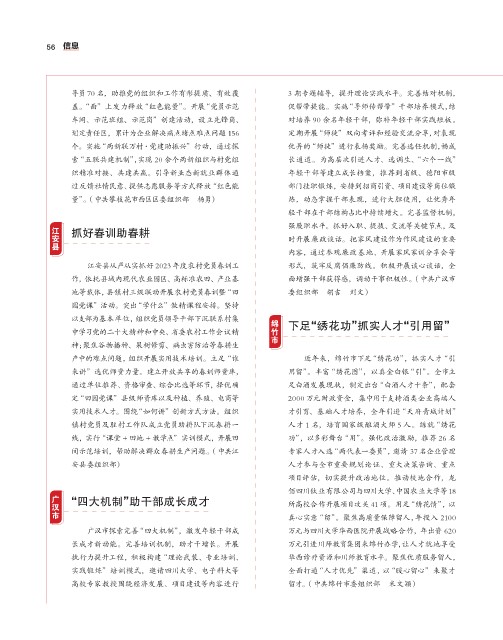 索“五联共建机制”,实现 20 余个两新组织与村党组 长通道。为高层次引进人才、选调生、“六个一线”