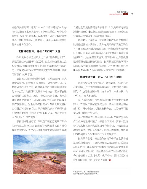 四川发展各级党组织大力开展“党委书记项目”、 建设项目。加强项目开工建设,旗下新兴产业园区投资