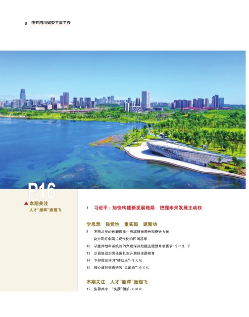 6 中共四川省委主管主办 P16 本期关注 1 习近平 :加快构建新发展格局 把握未来发展主动权 人才“雁阵”振翅飞 学思想 强党性 重实践 建新功 8 不断从党的创新理论中获取精神养分和奋进力量 奋力写好中国式现代化的四川篇章 10 从整体性和系统论的角度深刻把握主题教育总要求/陈江生 等 13 以高度政治责任感扎实开展好主题教育 14 下好理论学习“硬功夫”/徐文骏 15 精心谱好调查研究“三部曲”/唐宗礼 本期关注 人才“雁阵”振翅飞 17 集聚共享 “头雁”领航/张微微