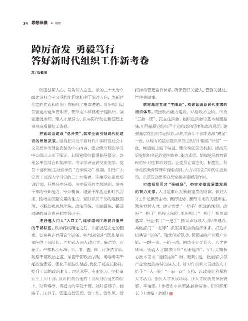 代党的建设和组织工作提供了根本遵循。组织部门肩 筑牢基层党建“主阵地”,构建紧跟新时代要求的