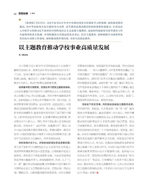 教育引向深入,推动学校事业高质量发展。 研究增强真实感悟。围绕学校“双一流”建设目标任务,