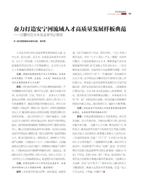 人才是米易经济社会高质量发展的强县之基、竞 进,先行区建设实干有成、落实有效。一是人才活力