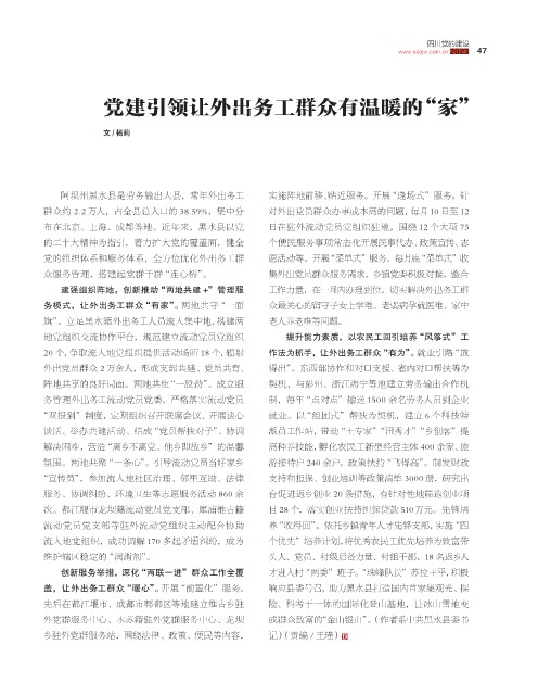 流入地党组织,成功调解 170 多起矛盾纠纷,成为 个优先”培养计划,将优秀农民工优先培养为致富带