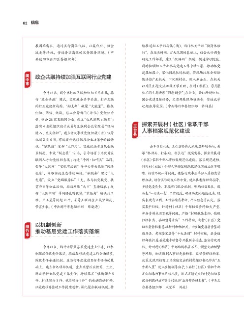 联网人才向党组织靠拢;打造“净网·红哨兵”品牌, (社区)常职干部人事档案规范化建设。落实规范建档。
