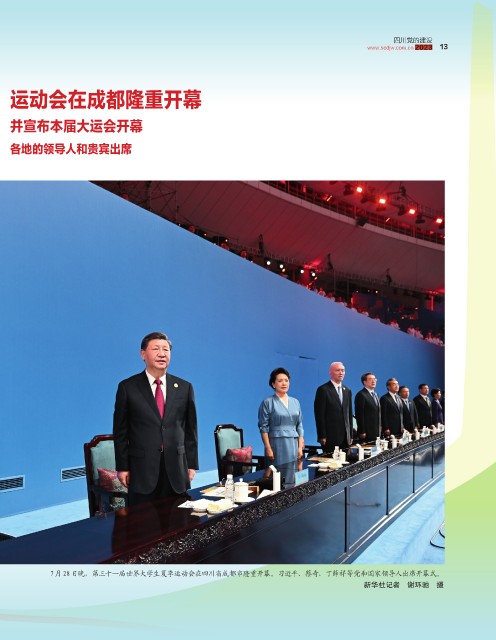 四川党的建设 www.scdjw.com.cn 2023 13 运动会在成都隆重开幕 第三十一届世界大学生夏季运动会 并宣布本届大运会开幕 在成都隆重开幕 各地的领导人和贵宾出席 习近平出席开幕式并宣布本届大运会开幕 蔡奇丁薛祥 来自世界各地的领导人和贵宾出席 7月28 日晚,第三十一届世界大学生夏季运动会在四川省成都市隆重开幕。习近平、蔡奇、丁薛祥等党和国家领导人出席开幕式。 新华社记者 谢环驰 摄