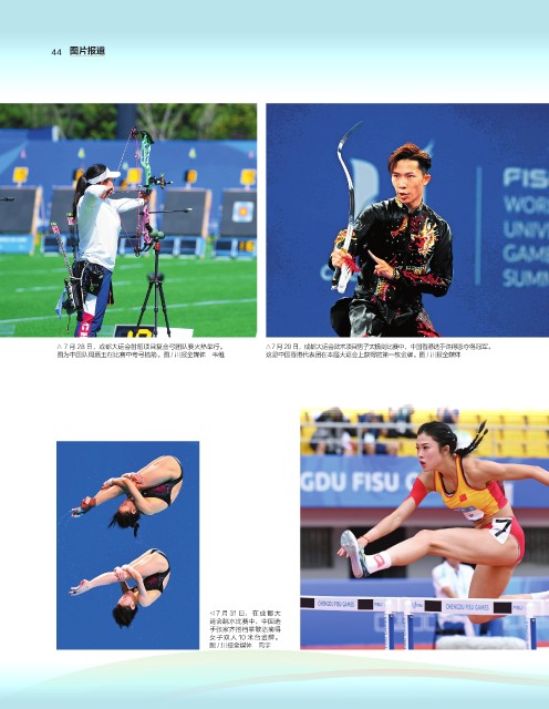 44 图片报道 44 44 7 月 28 日,成都大运会射箭项目复合弓团队赛火热举行。 7 月 29 日,成都大运会武术项目男子太极剑比赛中,中国香港选手许得恩夺得冠军。 图为中国队周嘉玉在比赛中弯弓搭箭。图 / 川报全媒体 韦维 这是中国香港代表团在本届大运会上获得的第一枚金牌。图 / 川报全媒体 7 月 31 日,在成都大 运会跳水比赛中,中国选 手张家齐搭档掌敏洁摘得 女子双人 10 米台金牌。 图 / 川报全媒体 向宇