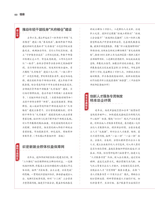 眉山市 推动年轻干部投身“天府粮仓”建设 新就业群体 3 万余人。二是强化人文关怀。打造