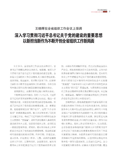 王晓晖在讲话中指出,党的十八大以来,习近平 托、砥砺奋进,确保四川党的建设和组织工作始终