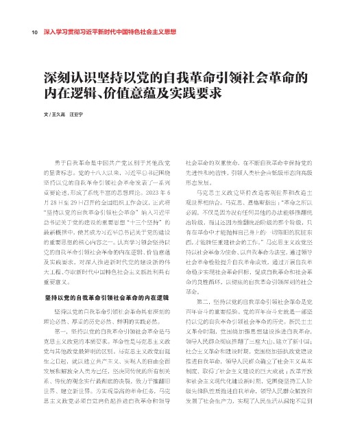 党的自我革命引领社会革命的内在逻辑、价值意蕴 持以社会革命为使命、以自我革命为法宝,通过领导