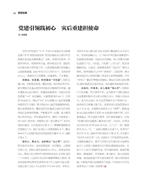 伍和服务群众等具体工作,以高质量党建引领地震灾 障解民忧。以浙江、成都教育医疗“组团式”帮扶为