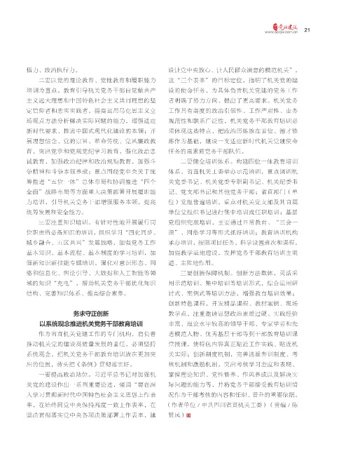 培训为重点。教育引导机关党务干部自觉做共产 设的使命任务,为具体负责机关党建的党务工作