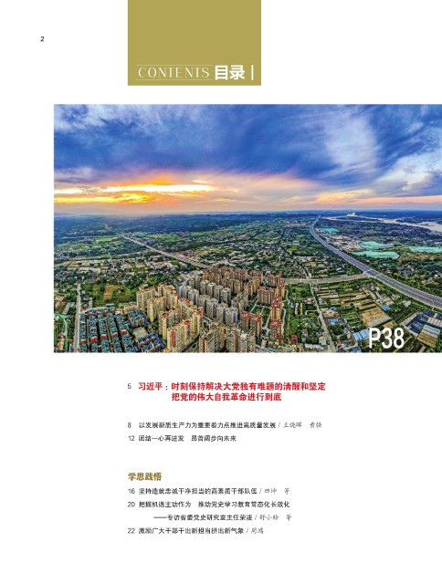 2 2 CONTENTS 目录 8 P3 P38 5 习近平 :时刻保持解决大党独有难题的清醒和坚定 把党的伟大自我革命进行到底 8 以发展新质生产力为重要着力点推进高质量发展 / 王晓晖 黄强 12 团结一心再进发 昂首阔步向未来 学思践悟 16 坚持造就忠诚干净担当的高素质干部队伍 / 田坤 等 20 把握机遇主动作为 推动党史学习教育常态化长效化 —专访省委党史研究室主任荣凌 / 舒小铃 等 22 激励广大干部干出新担当拼出新气象 / 周鸿