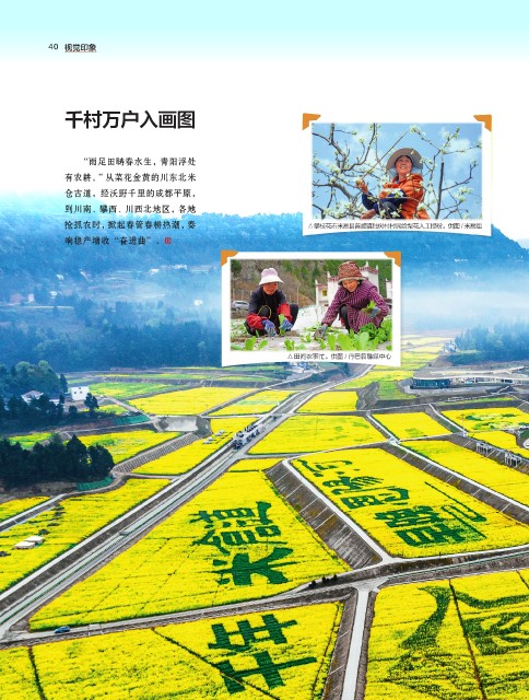 40 视觉印象视觉印象 40 千村万户入画图 “雨足田畴春水生,青阳浮处 有农耕。”从菜花金黄的川东北米 仓古道,经沃野千里的成都平原, 到川南、攀西、川西北地区,各地 抢抓农时,掀起春管春耕热潮,奏 攀枝花市米易县普威镇独树村村民给梨花人工授粉。供图 / 米易组 响稳产增收“奋进曲”。 田间农事忙。供图 / 丹巴县融媒中心
