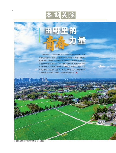 24 本期关注 田野里的 新时代是奋斗者的时代,奋斗是青春最亮丽的底色。当青 年遇到乡村振兴,青春的力量在田野里不断迸发。他们积极响应 国家的号召,投身乡村,脚踏实地,不畏艰苦,勇于拼搏,用行动 诠释新时代青年的使命和担当 ;他们思想活跃、视野开阔,特别 注重把新技术、新知识、新模式和乡村实践紧密结合起来,不断 汇聚乡村振兴的强大力量……近日,记者深入乡间田野蹲点探 访,倾听青年与田野、与青春、与梦想有关的故事。 温江区万春镇和林村稻蒜种植基地。图 / 张志强