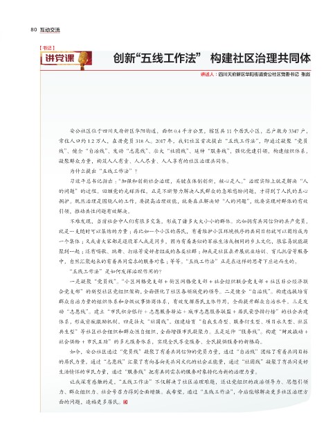 力、群众组织力、社会号召力得到全面增强。我希望,通过“五线工作法”,今后能够解决更多社区治理方