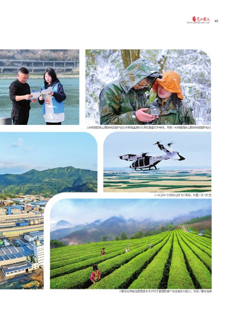 41 www.scdjw.com.cn 大熊猫国家公园荥经县管护总站大熊猫监测队队员在查看红外相机。供图 / 大熊猫国家公园荥经县管护总站 AE200 全倾转过渡飞行现场。供图 / 沃飞长空 攀枝花市盐边县国胜乡大毕村千亩国胜茶产业助推乡村振兴。供图 / 攀枝花组