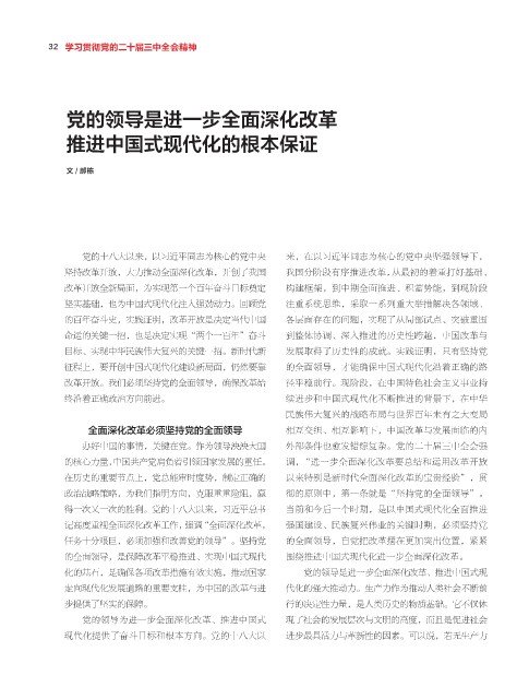 党的领导为进一步全面深化改革、推进中国式 现了社会的发展层次与文明的高度,而且是促进社会