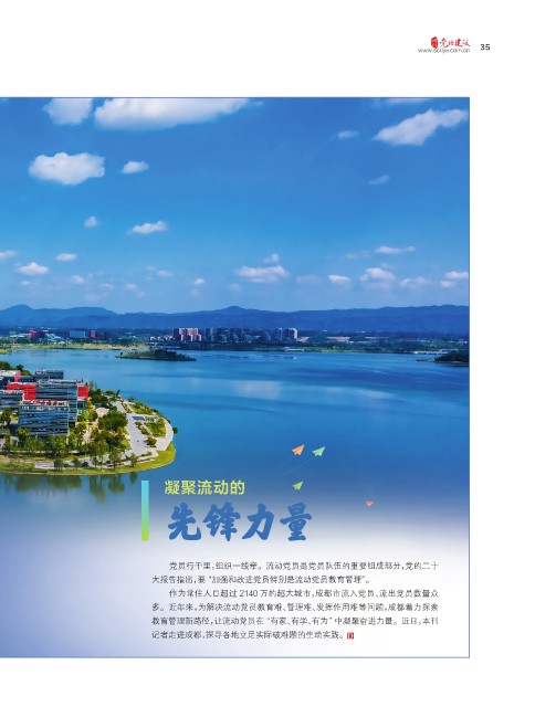 35 www.scdjw.com.cn 凝聚流动的 先锋力量 党员行千里,组织一线牵。流动党员是党员队伍的重要组成部分,党的二十 大报告指出,要“加强和改进党员特别是流动党员教育管理”。 作为常住人口超过 2140 万的超大城市,成都市流入党员、流出党员数量众 多。近年来,为解决流动党员教育难、管理难、发挥作用难等问题,成都着力探索 教育管理新路径,让流动党员在“有家、有学、有为”中凝聚奋进力量。近日,本刊 记者走进成都,探寻各地立足实际破难题的生动实践。