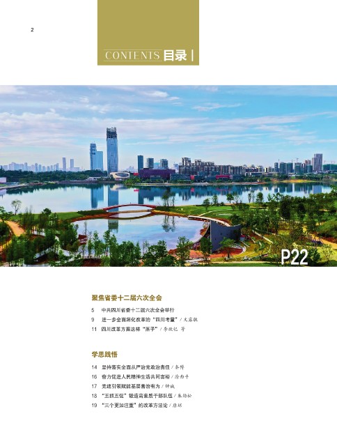 2 2 CONTENTS 目录 P22 P22 聚焦省委十二届六次全会 5 中共四川省委十二届六次全会举行 9 进一步全面深化改革的“四川考量”/ 文露敏 11 四川改革方案这样“落子”/ 李欣忆 等 学思践悟 14 坚持落实全面从严治党政治责任 / 秦博 16 奋力促进人民精神生活共同富裕 / 涂曲平 17 党建引领赋能基层善治有为 / 钟诚 18 “五抓五促”锻造高素质干部队伍 / 朱劲松 19 “三个更加注重”的改革方法论 / 唐琼