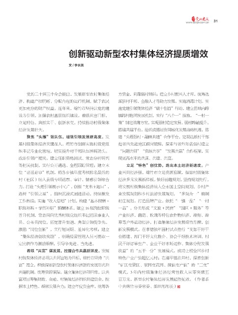 共建机制。统筹资源保障。建立集体经济项目库,以共 模式,3 年内村级集体经济经营性收入从零突破至