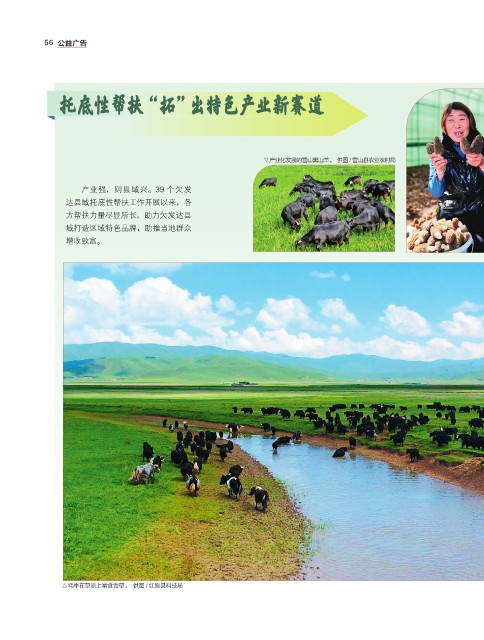 踔厉奋发新时代 治蜀兴川再跨越 56 公益广告 托底性帮扶“拓”出特色产业新赛道 产业化发展的营山黑山羊。 供图 / 营山县农业农村局 产业强,则县域兴。39 个欠发 达县域托底性帮扶工作开展以来,各 方帮扶力量尽显所长,助力欠发达县 域打造区域特色品牌,助推当地群众 增收致富。 牦牛在草原上啃食青草。 供图 / 红原县科技局