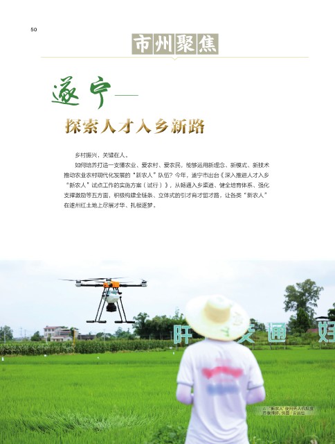 50 50 党建视点 市州聚焦 遂宁 探索人才入乡新路 乡村振兴,关键在人。 如何培养打造一支懂农业、爱农村、爱农民,能够运用新理念、新模式、新技术 推动农业农村现代化发展的“新农人”队伍?今年,遂宁市出台《深入推进人才入乡 “新农人”试点工作的实施方案(试行)》,从畅通入乡渠道、健全培育体系、强化 支撑激励等五方面,积极构建全链条、立体式的引才育才留才路,让各类“新农人” 在遂州红土地上尽展才华、扎根逐梦。 “新农人”使用无人机投放 赤眼蜂卵。供图 / 安居组