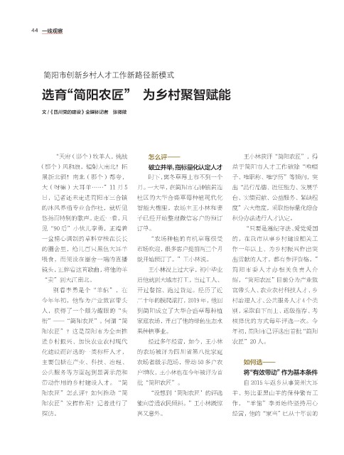 带动作用的乡村建设人才。“简 批“简阳农匠”。 自 2015 年返乡从事简州大耳