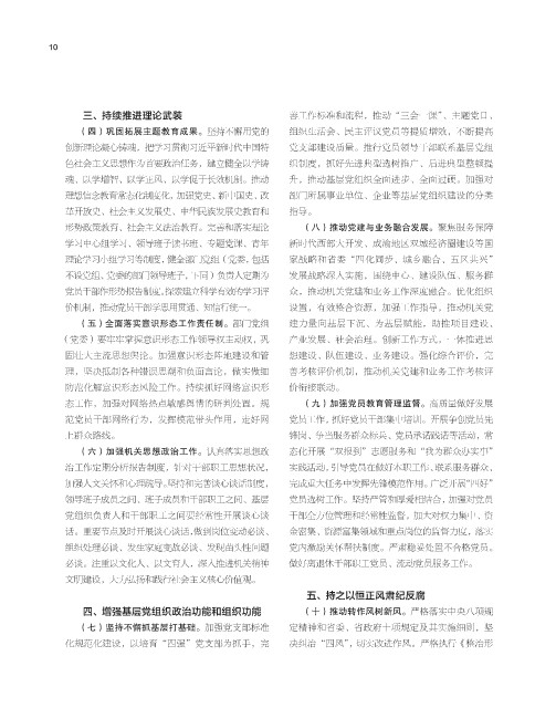 创新理论凝心铸魂,把学习贯彻习近平新时代中国特 党支部建设质量。推行党员领导干部联系基层党组