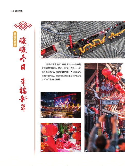 54 视觉印象视觉印象 54 54 新春的脚步临近,巴蜀大地处处洋溢着 浓厚的节日氛围,花灯、彩龙、庙会……无 论是繁华都市,或是韵味古城,人们都以各 自独特的方式,表达着对美好生活的向往和 对新一年的真切祝福。