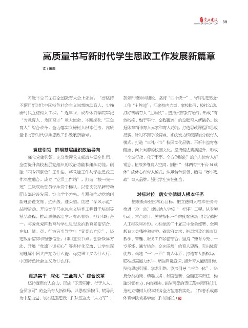 新时代立德树人工程。”近年来,成都体育学院牢记 打好铸魂育人“主动仗”。坚持贯穿教育始终,形成“有