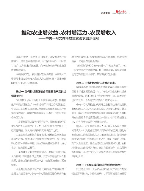 围绕粮食安全、农民增收等热点话题,中央农村工 途等方面作出重点部署,筑牢粮食安全根基。