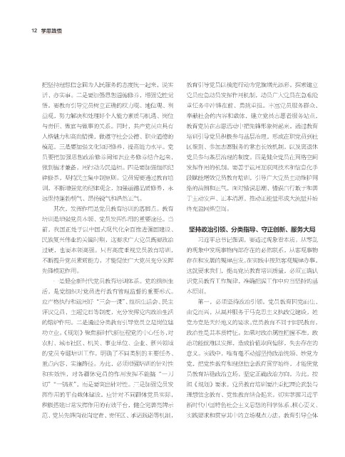 的熔炉作用。二是通过分类教育引导党员立足岗位建 党为党是天经地义的要求。党员教育不同于国民教育,