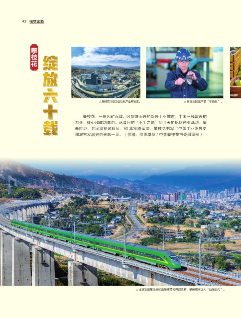 42 视觉印象视觉印象 42 42 攀枝花市盐边县钒钛产业开发区。 攀钢集团生产的“手撕钛”。 攀枝花,一座因矿而建、因钢铁而兴的新兴工业城市,中国三线建设的 龙头、核心和成功典范。从昔日的“不毛之地”到今天的钒钛产业基地、康 养胜地、共同富裕试验区,60 年筚路蓝缕,攀枝花书写了中国工业发展史 和城市发展史的光辉一页。(供稿、供图单位 / 中共攀枝花市委组织部) 成昆铁路复线昆明至攀枝花段开通运营,攀枝花市进入“动车时代”。