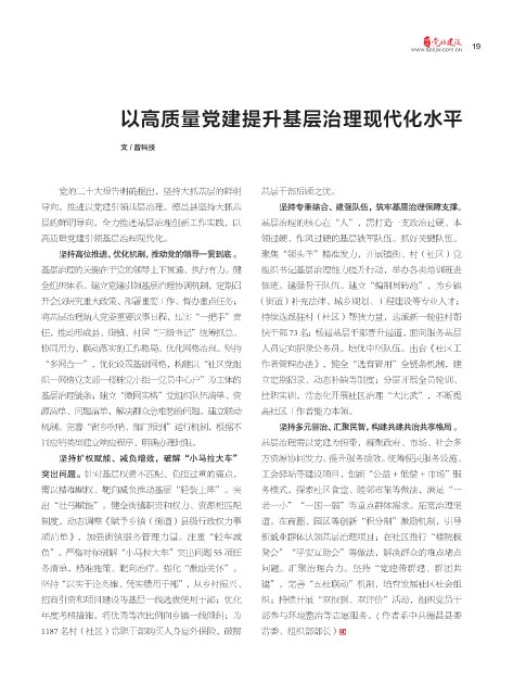 高质量党建引领基层治理现代化。 领过硬、作风过硬的基层铁军队伍。抓好关键队伍。