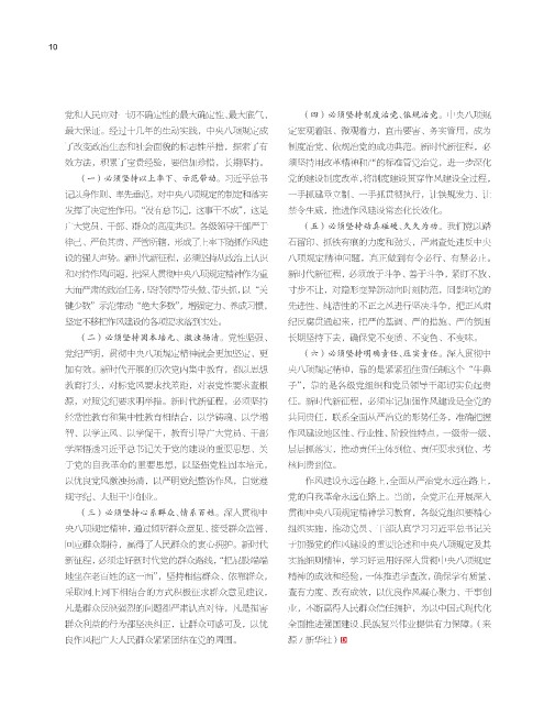 最大保证。经过十几年的生动实践,中央八项规定成 定宏观着眼、微观着力,直击要害、务实管用,成为