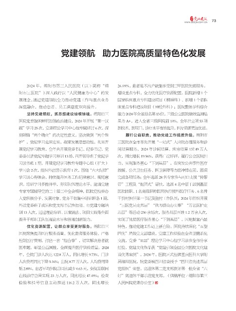 坚持党建领航,抓思想建设培根铸魂。绵阳市三 能力2024年全省排名第13位,三级公立医院绩效监测结