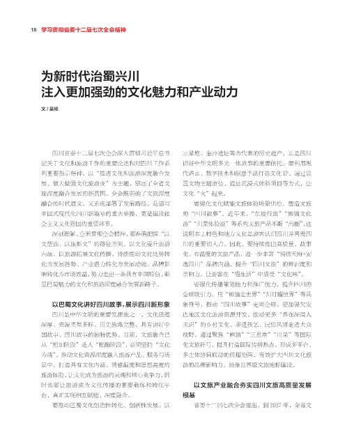 内涵,以旅游拓展文化传播,持续推动文化优势转 化、有温度的文旅产品,进一步丰富“锦绣天府·安