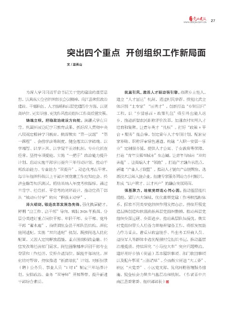为深入学习习近平总书记关于党的建设的重要思 筑巢引凤,激活人才驱动强引擎。 凝聚乡土能人。