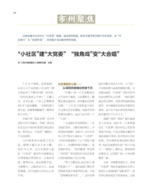 理、落实社区“大党委”制度的一 盾该如何破解? 2023 年,达州市印 资源与职能,主动认领城乡融合环