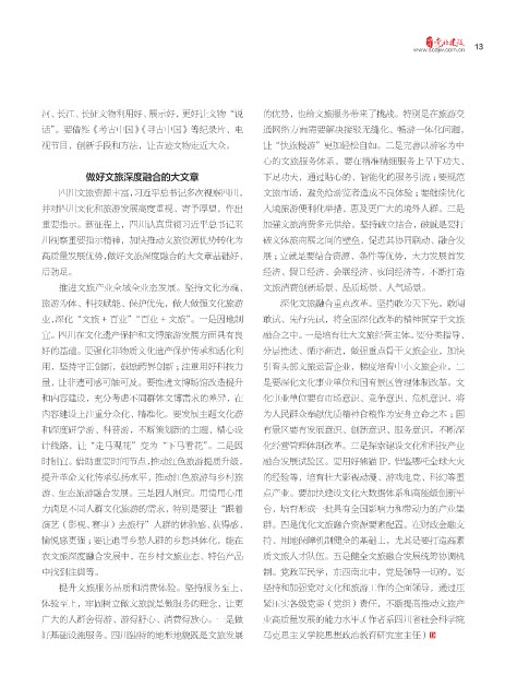 重要指示。新征程上,四川认真贯彻习近平总书记来 加强文旅消费多元供给。坚持破立结合,破就是要打