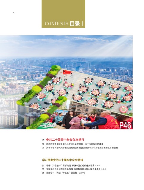 4 4 CONTENTS 目录 P46 P4 6 06 中共二十届四中全会在京举行 12 中共中央关于制定国民经济和社会发展第十五个五年规划的建议 26 关于《中共中央关于制定国民经济和社会发展第十五个五年规划的建议》的说明 学习贯彻党的二十届四中全会精神 30 领悟“六个坚持”科学内涵 开辟中国式现代化新境界 / 胡敏 33 贯彻党的二十届四中全会精神 加快我省农业农村现代化步伐 / 杨颖 35 接续奋斗,奔赴“十五五”新航程 / 益胜刚