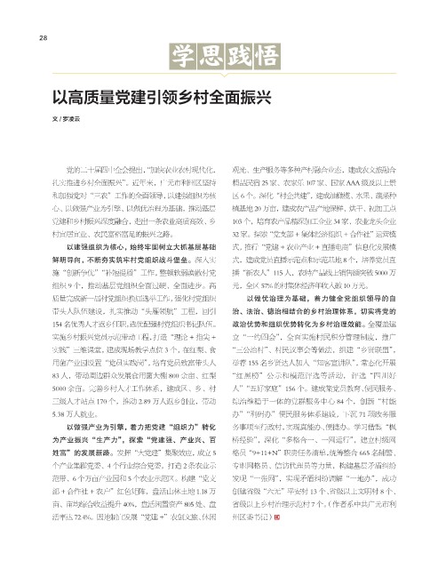 党建和乡村振兴深度融合,走出一条农业高质高效、乡 103 个,培育农产品精深加工企业 34 家、农业龙头企业
