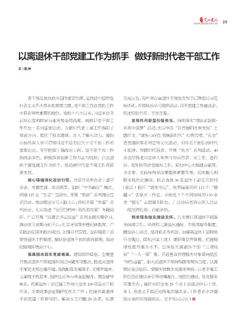 休干部党建工作为抓手,推动新时代老干部工作高质 协、老体协等涉老组织工作,紧扣中心大局建言献策,