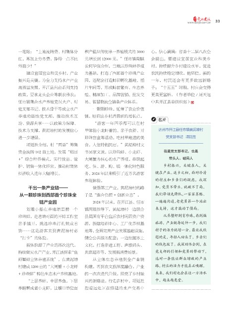 建设宜居宜业和美乡村,产业 为基础,打造了西部首个珍珠产业 农民持续稳定增收。他坚信,新的