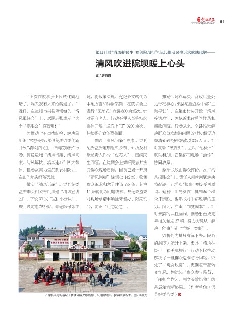 开展“清风护民生 福美院坝行”行 纪委监委定期组织乡镇、站所及村 对复杂“硬骨头”,启动“纪检 +”